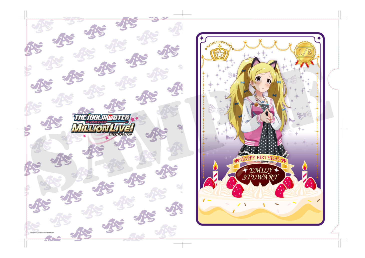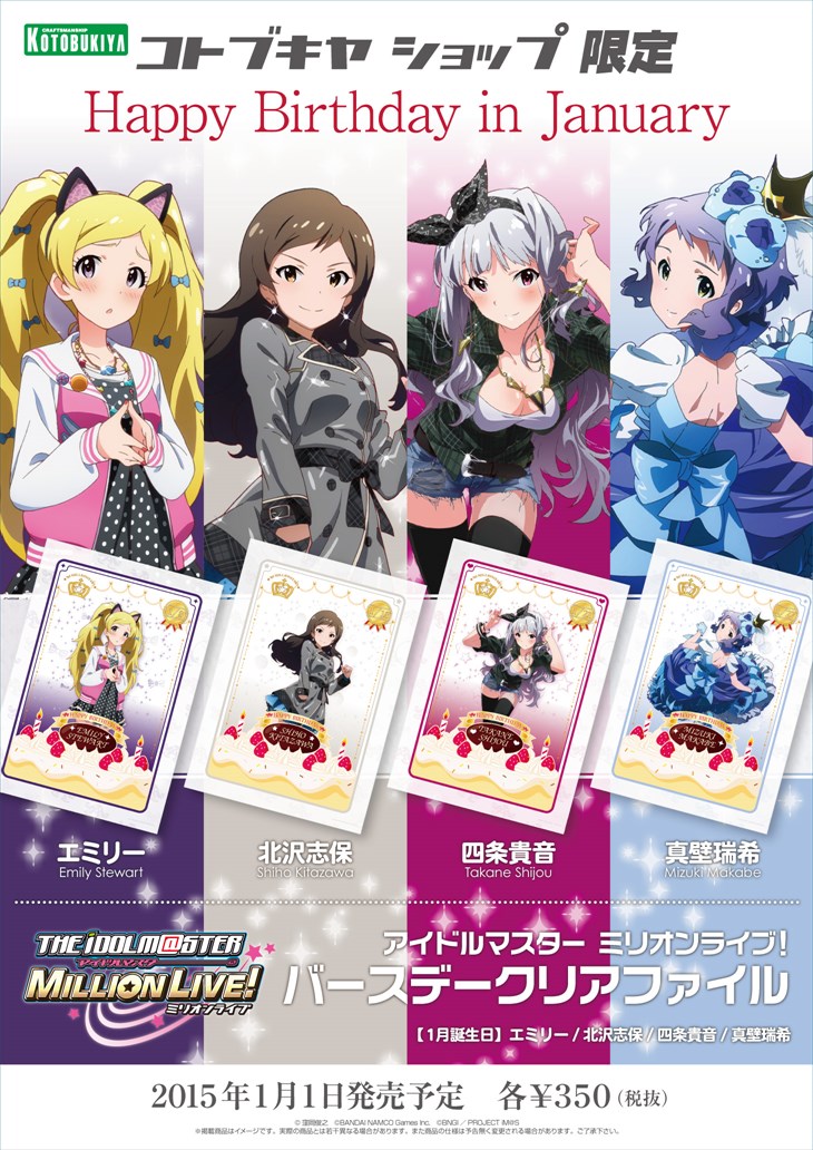 アイドル達のイラストはTVアニメ「THE IDOLM@STER」・劇場版「THE IDOLM@STER 輝きの向こう側へ!」制作のA-1 Picturesがゲームのために描き下ろしたものを使用。フレームにそれぞれのキャラクターのイメージカラーとバースデーケーキを加え、誕生日を迎えるアイドル達を豪華に、そして可愛くアレンジしたデザインのクリアファイルとなっています。第7弾として、1月が誕生日である「エミリー・スチュアート」「北沢志保」「四条貴音」「真壁瑞希」のクリアファイルを2015年1月1日より発売予定です。