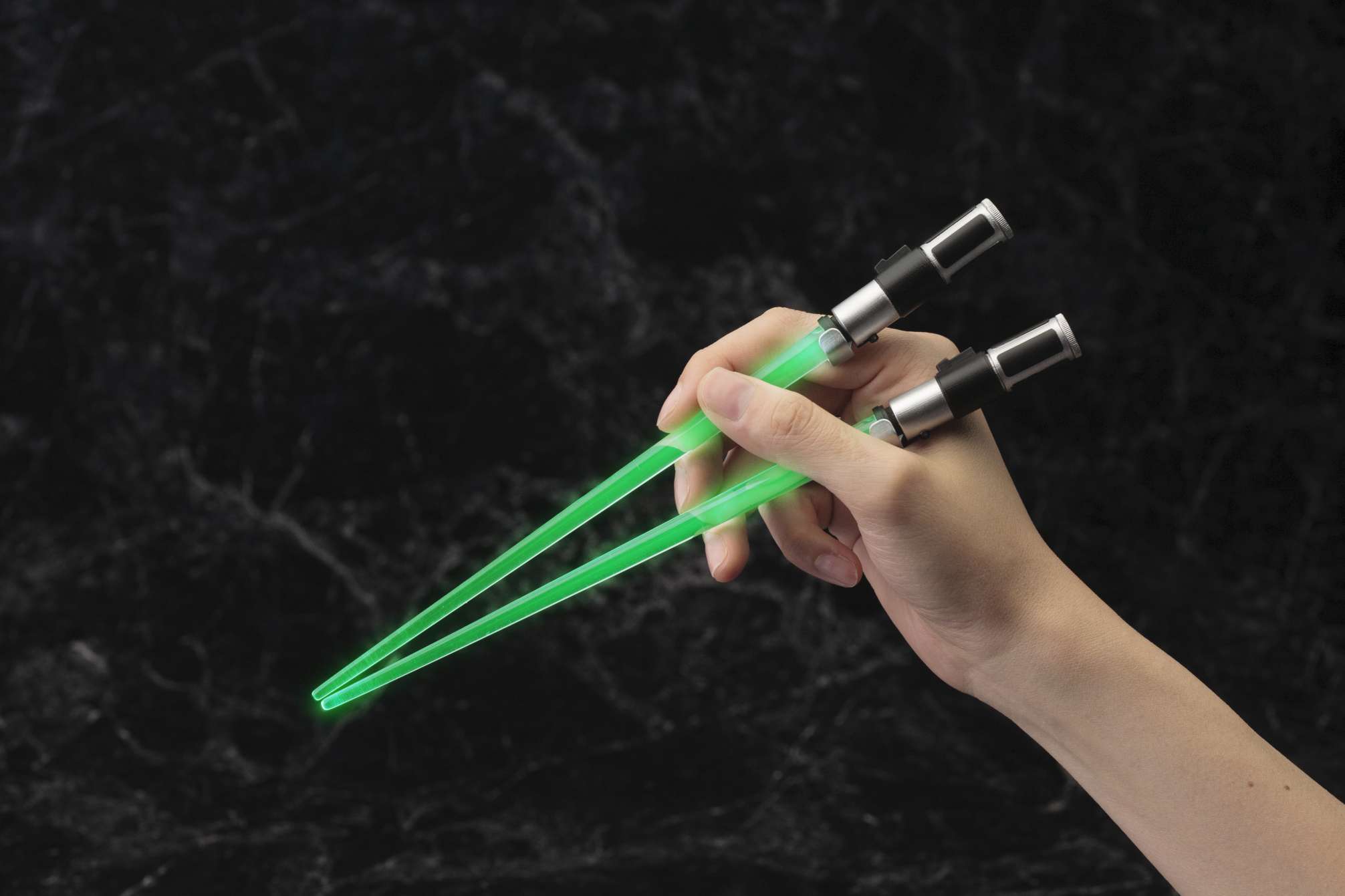 映画『スター・ウォーズ』より、LED発光ギミックを搭載した“光るお箸”第2弾は、ライトセーバーチョップスティックでも好評のジェダイ・マスター「ヨーダ」と「メイス・ウィンドゥ」。ヨーダはグリーンに光るライトセーバー、メイス・ウィンドゥは印象的な紫のライトセーバーをモデルに、劇中同様スイッチボタンをONにする事で刀身である箸先が光る仕様となっています。箸先端の光刃部分は無色透明のクリア成型となっており、取り外しが可能で、洗って清潔に保つことができます。スター・ウォーズファンへは勿論の事、パーティグッズやプレゼントとしても喜ばれる事間違いなしのアイテムです。貴方の食卓へフォースのパワーをお届けします。