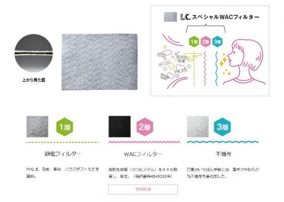 WACフィルターとは、99%放射性物質(ヨウ化メチル)を吸着することが実証された高機能フィルターで、元東京大学教授の野川憲夫氏、株式会社ワカイダ・エンジニアリング、東洋紡株式会社の共同発明により生まれました(特許番号 4549388)。従来の工業用機器に使用されているフィルターに比べ軽くて薄く、原子力発電所や、大学病院などで活用されているWACフィルターを、PM2.5、花粉、黄砂、ハウスダストを通さない静電フィルターと不織布とで挟み、3層構造にしたのが「i.c.スペシャルWACフィルター」です。同時発売のポケット付マスクに入れて、日常的に使えます。また、一度フィルターに吸着された物質は、化学反応を利用して二度と外には出ないため、フィルターごと燃えるゴミとして捨てることができます。