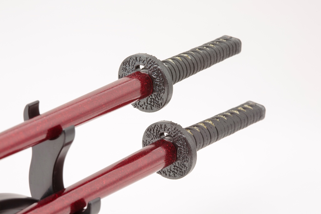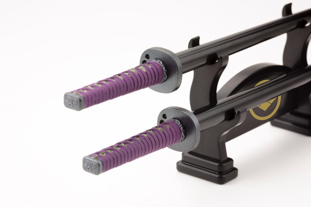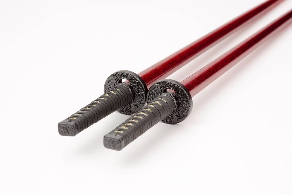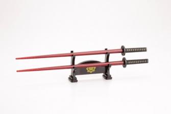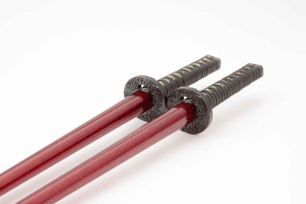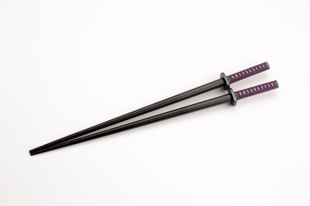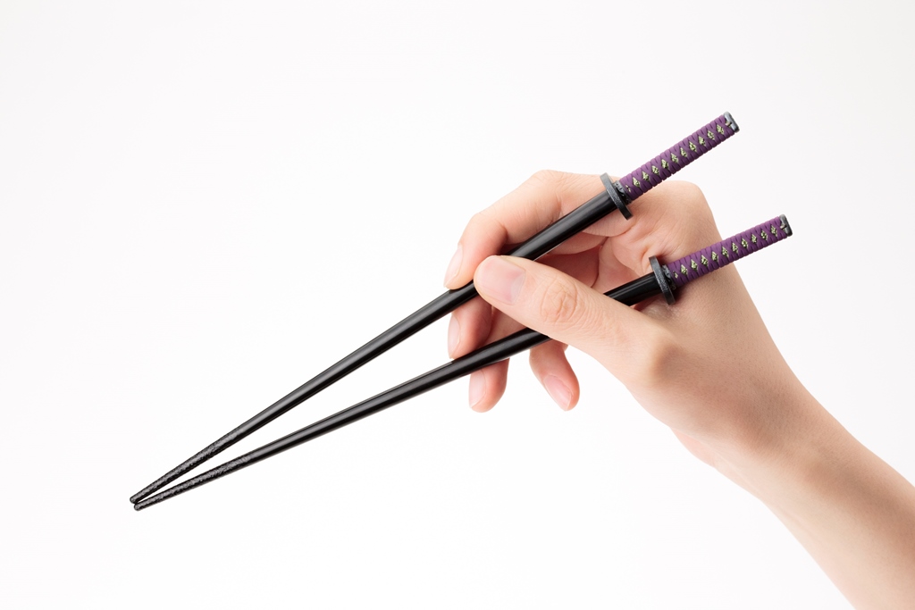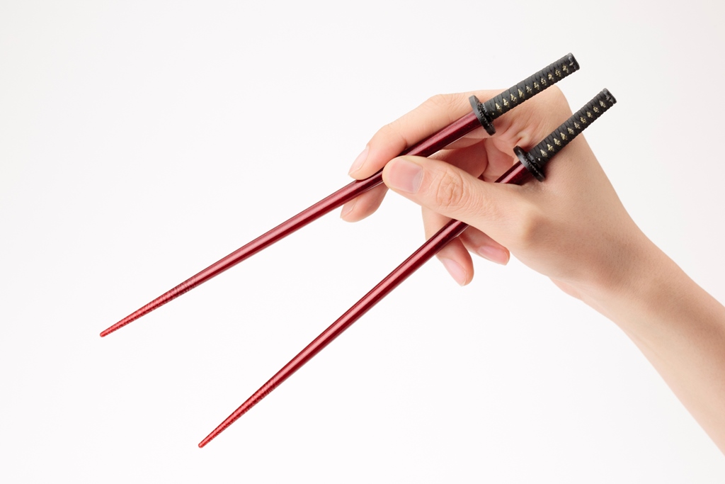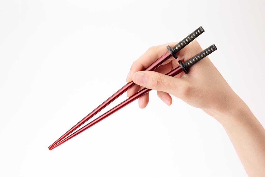坂本龍馬は愛刀「陸奥守吉行」をモチーフにしつつ、鍔は実際寺子屋事件の際に持っていた刀についていたと言われる「唐獅子牡丹鍔」を元に造型、高杉晋作は愛刀「安芸国佐伯荘藤原貞安」をモチーフに鍔などの部分のデザインにこだわり造型しました。新シリーズ“侍箸”の特徴として、各お箸には「刀台」をイメージした家紋入の箸置き(坂本龍馬:「組み合わせ角に桔梗」紋/高杉晋作:「丸に割り菱」紋)が付属。そして、箸先には新しく滑り止め加工が施され、より使いやすくなっております。歴史ファンにはたまらない、プレゼントやお土産にも最適な逸品です。試合やテストなど勝負の日には連戦連勝を願って、より使い易くなった“侍箸“で美味しくご飯を召し上がってはいかがですか。