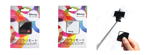 そしてワイヤレスのBluetoothシャッターリモコン『プリクラリモート』。無線を使用してリモコンでカシャ!とシャッターが切れるのでその他大勢で撮影するときに、プリクラスティックを持つ人とは別の仲間がプリクラリモートを持ってシャッターを切れるので、仲間と楽しんで撮影ができとても便利です。 また三脚等のスマートフォンを乗せる台があれば『プリクラリモート』のリモコンシャッターで集合写真等を撮れるので、タイマーではタイミングが難しいセルフ撮影を離れたところから好きなタイミングで撮影できる使い勝手が抜群な商品です。