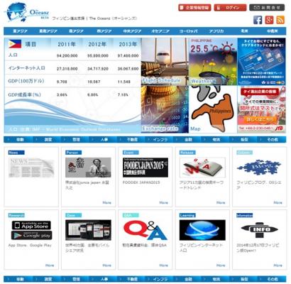 「The Oceanz フィリピン版」は、フィリピン進出を検討している企業様と、フィリピン進出支援でサービスを展開している企業様とを繋ぐ、海外進出支援ソーシャルサイトです。サイト内で約121業種からフィリピン進出支援企業を検索することができ、会社情報や各企業が配信している情報を無料で閲覧することができます。また、サイトを介して直接掲載企業様にお問い合わせをすることもでき、こちらも無料でお使いいただけます。すでにフィリピンでサービスを展開されている企業様は、「The Oceanz フィリピン版」に登録することで、会社情報の掲載に加え、コラムや広告掲載など様々な形で会社の情報を配信することができ、会社をアピールすることが可能です。現在はタイ、香港、台湾、シンガポール、フィリピンのみのサービスとなっていますが、2014年末にアジア各国、その後GDP上位の40の国と地域に展開予定です。