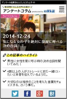 不動産業界に特化したインターネットサービスを提供する株式会社いえらぶGROUP(本社:東京都新宿区、代表取締役:岩名泰介 以下、「いえらぶGROUP」)は、2014年12月24日に住まいに関する“気になる”を集めた「いえらぶアンケートコラム」のPC版をリニューアル、スマホ版をリリース致しました。