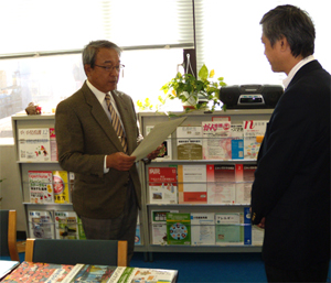 12月2日(火)、静岡トーハン会を代表して江崎書店・渡部松徳取締役とトーハン静岡支店の平野浩一アシスタントマネジャーが、静岡県立こども病院(静岡市葵区)を訪問し、「入院している子どもたちのために本を活用してほしい」と本を手渡しました。