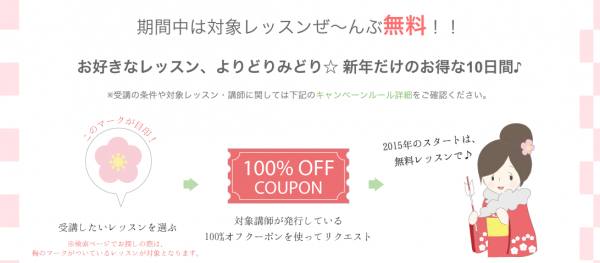 嬉しい「100%オフ」クーポンのお年玉は、25日の本日から新春レッスンのご予約にご利用頂けます。