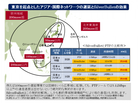 独自開発の通信プロトコルSSBP※1により、インターネット上で高速伝送するソフトウェア「SilverBullet」は2011年のリリース以降、放送・アニメ―ション制作、研究・開発機関、大手製造業などを中心に120社を超える顧客企業に導入・利用されています。また、昨秋にはHTTP(S)通信の高速化機能やモバイル対応機能を持つSDK※2を発表し、その後、一部改廃を含めてラインナップを整備してまいりました。