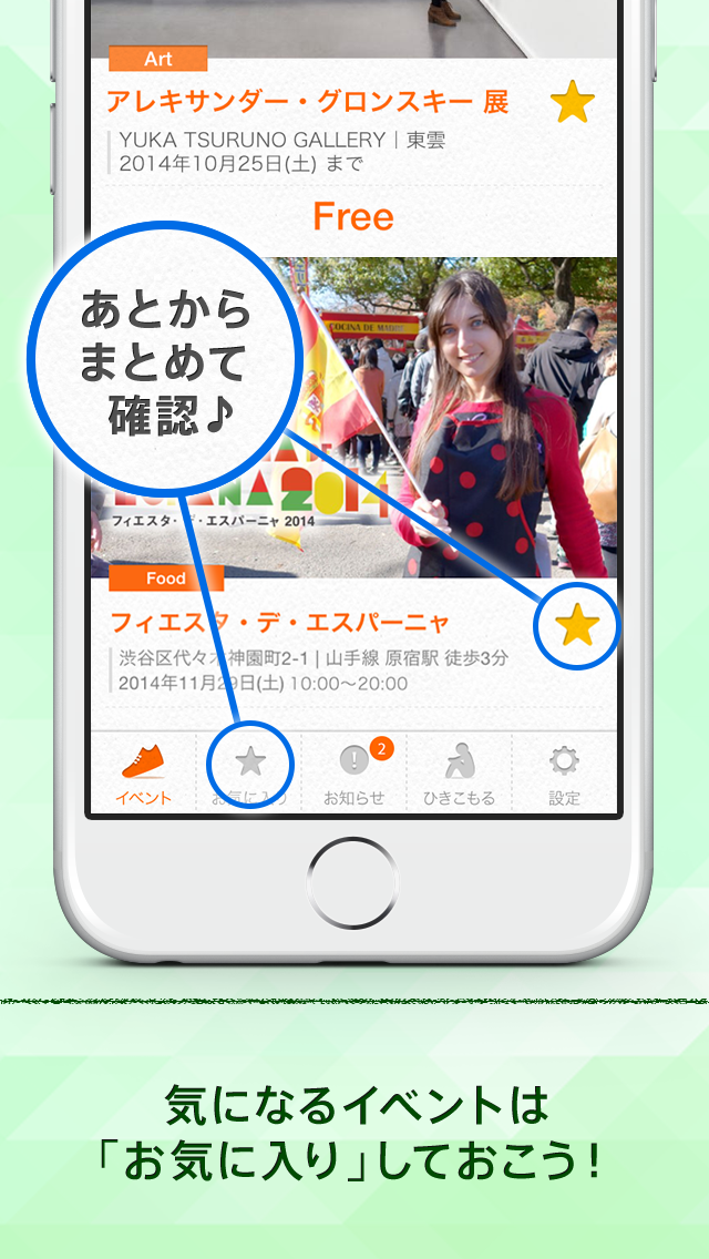 興味を持ったイベントには「お気に入り」ボタンを押しておいて、お気に入り一覧から、あとでゆっくりと見返すことができます。追加順と開催日順に並べ替えることも可能です。