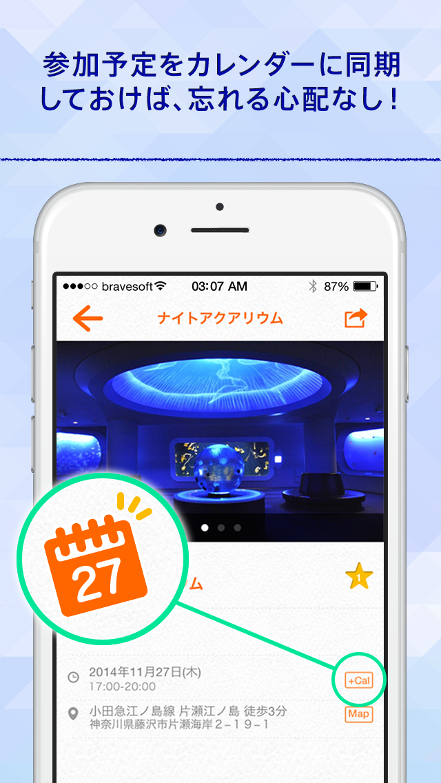 イベントの詳細画面から、1タップでiPhoneカレンダーにイベントを登録することができます。カレンダーに入れておけば、予定を忘れる心配もありません。