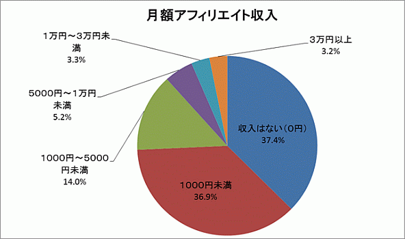 アフィリエイト収入の面では、月3万円以上のアフィリエイト収入があるのは全体の3.2%、アフィリエイターの74.3%が収入1,000円未満という調査結果となりました。2013年度の調査では月3万円以上が2.4%、月1,000円未満が78.4%という結果でしたので、昨年に比べるとアフィリエイターの収入は増加傾向にあります。