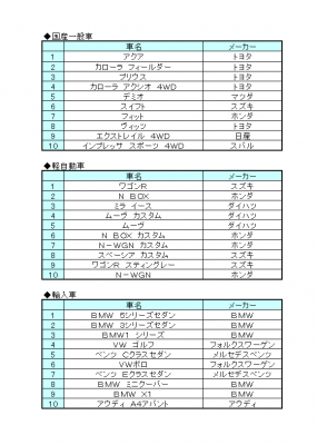 国産一般車部門は、アクア(トヨタ)が首位に躍り出ました。更に上位4台をトヨタ車が独占する結果になりました。軽自動車部門は、ワゴンR(スズキ)とN BOX(ホンダ)のツートップが先月と変わらず人気を見せております。ムーヴ(ダイハツ)も先月に引き続き、順位をキープしました。輸入車部門は、トップ3をBMWが独占。ラインナップも先月と変わらず、根強い人気を見せております。今後もオークネットでは、中古車市場での成約ランキングのほか、様々な中古車に関する注目度の高い情報を発信して参ります。