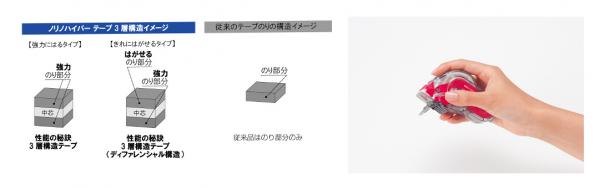 新開発の3層構造テープを採用し、粘着力を当社従来品比約3倍に高めた「超強力にはるタイプ」と、粘着力も強力ではがす際に糊残りがしにくい「きれいにはがせるタイプ」の2種類。「超強力にはるタイプ」は高い粘着性能で厚紙の封筒とじや伝票整理、POP・プレゼンボード制作、紙工作等に最適。「きれいにはがせるタイプ」は、はがした跡が残りにくく、ポスター掲示、仮貼り用にお奨めです。
