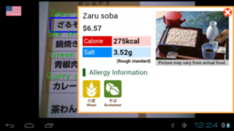 メガネ型デバイスを使ってメニューの文字情報から、そのメニューの翻訳に加え、目安の塩分・カロリー・アレルゲン情報が取得できます。