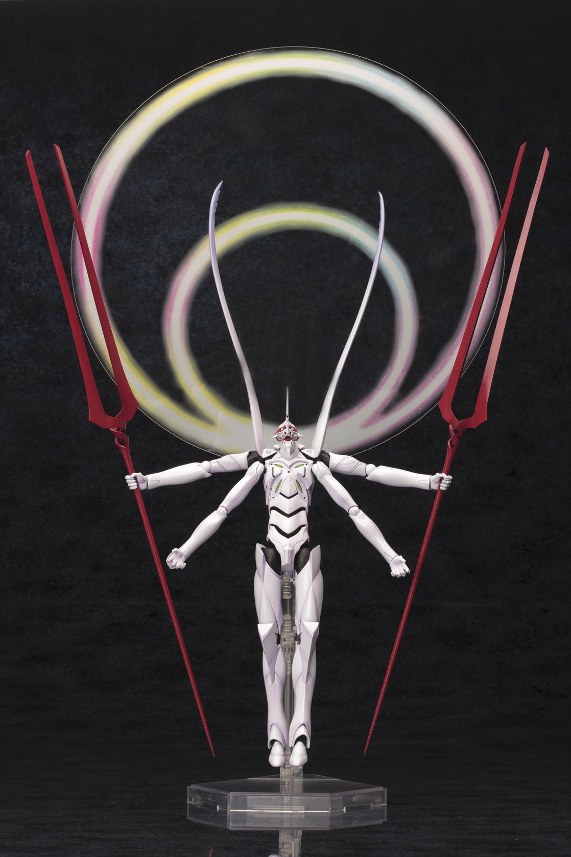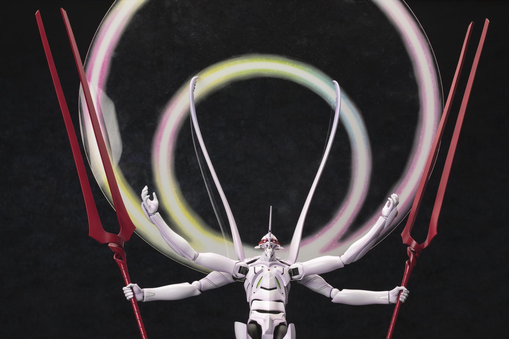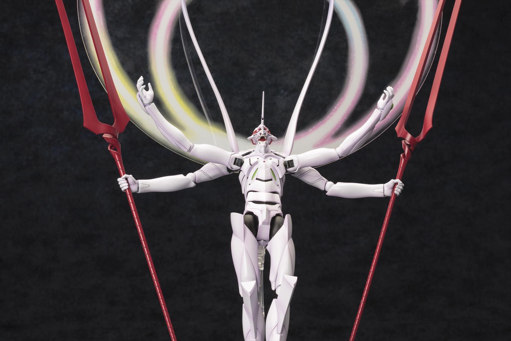 口の展開は可動により差し替え無しで、副腕の展開状態を差し替えでそれぞれ再現可能です。腿前面と膝頭が連動して可動し、顔を上に向ける際に、喉部が連動して可動します。収束状態の槍をジョイントパーツと2本分の柄を使用し再現できます(収束状態は1本のみ再現可能)。疑似シン化第3+形態時の瞳、通常時の瞳は塗装にて表現しております。