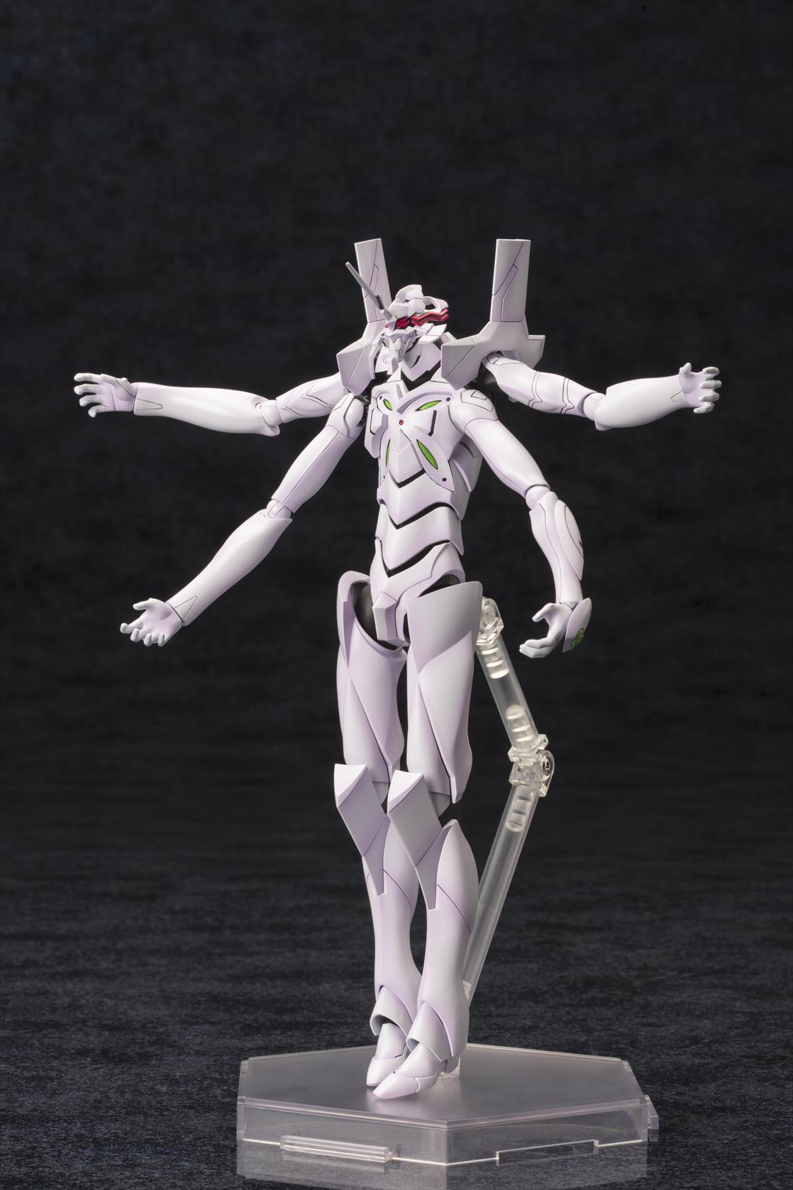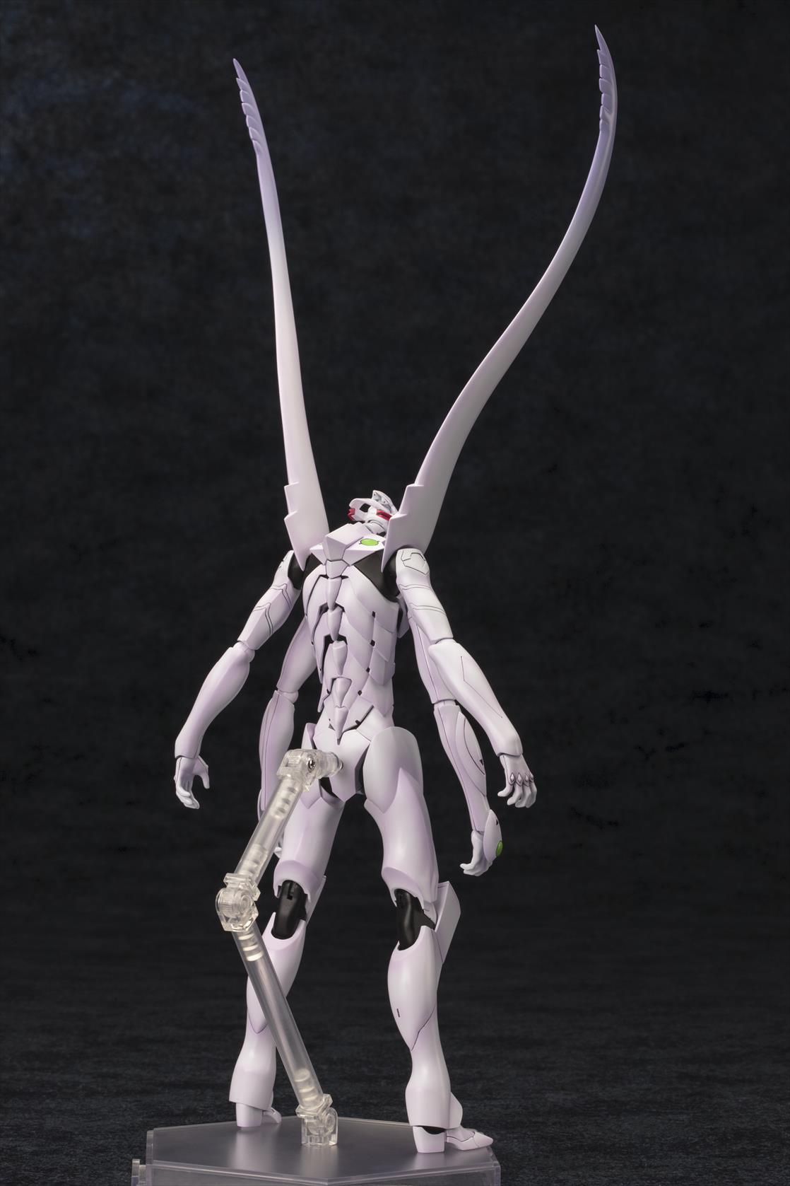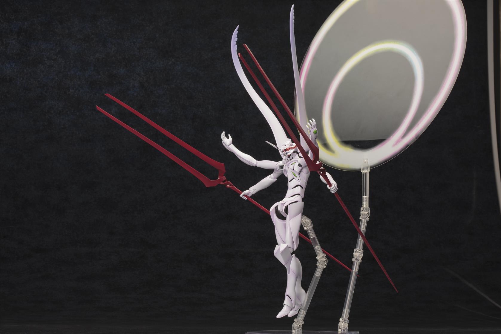 口の展開は可動により差し替え無しで、副腕の展開状態を差し替えでそれぞれ再現可能です。腿前面と膝頭が連動して可動し、顔を上に向ける際に、喉部が連動して可動します。収束状態の槍をジョイントパーツと2本分の柄を使用し再現できます(収束状態は1本のみ再現可能)。疑似シン化第3+形態時の瞳、通常時の瞳は塗装にて表現しております。