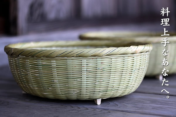 放射状に重ねた竹ヒゴへ、さらに細い竹ヒゴを回しながら編み込んでいく菊底編み。その美しい底部分には、可愛らしい小さな足が3つあしらわれています。身の厚い竹節部分で作られていますので、小さくても充分な安定感。足付きのため通気性も良く、置いておくだけで簡単に水を切れるため、とても便利です。
