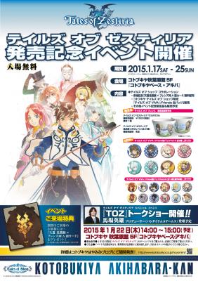 ホビーメーカー株式会社壽屋(本社:東京都立川市曙町/代表:清水一行)は、今年20周年を迎えた人気RPG『テイルズ オブ』シリーズ最新作『テイルズ オブ ゼスティリア』の発売を記念したイベントを、2015年1月17日(土)~25日(日)の期間開催します。ゲームの発売日である1月22日(木)には、馬場英雄プロデューサー(バンダイナムコゲームス)をゲストに迎えたトークショーも開催します。
