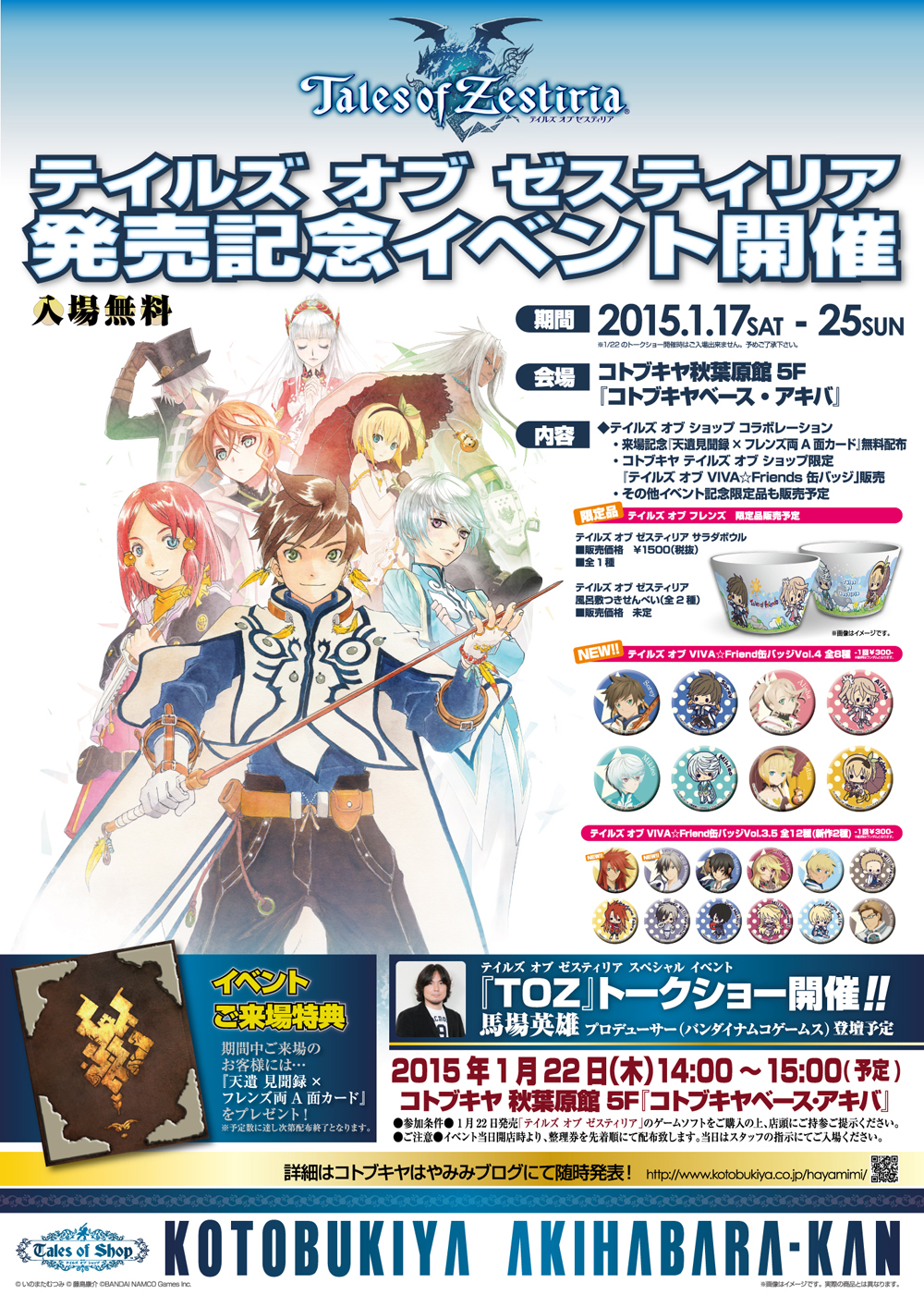 イベントでは、コトブキヤの人気シリーズ「テイルズ オブ フレンズ」より、サラダボウル/風呂敷つきせんべい/缶バッジなどのイベント限定品を販売します。また、コトブキヤ 秋葉原館の「テイルズ オブ ショップ」ともコラボレーションし、「天遺見聞録×フレンズ両A面カード」をイベントにご来場いただいた方へプレゼントします。いち早く『テイルズ オブ ゼスティリア』の世界を楽しんで頂けるイベントにぜひご期待ください。
