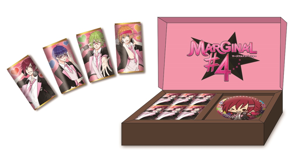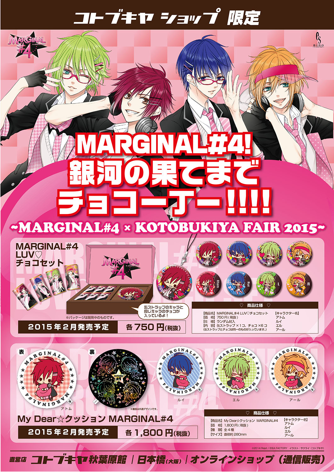 ホビーメーカー株式会社壽屋(本社:東京都立川市曙町/代表:清水一行)は、“Rejet”のアイドルユニット「MARGINAL#4(マージナルナンバーフォー)」より、缶ストラップとチョコがセットになった「限定チョコセット」と、イラストレーターサクライ氏のデフォルメイラストが描かれた「クッション」を2015年2月に直営店(秋葉原館、日本橋、オンラインショップ)限定で発売します。
