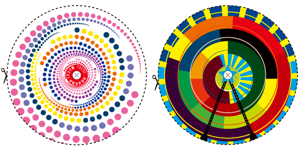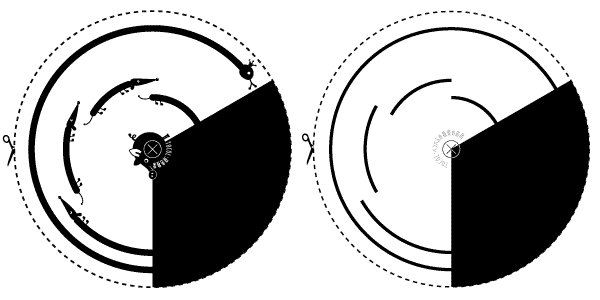 ※このコマは、黒地面積を全円の1/3にしている。また、色の比較を単純にするため、黒い線の円弧は、中心角60度の4本だけにしている。