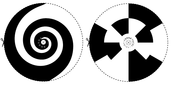 ・回転混色コマ(うずまき編)を回すと、色のうずまきとともに、逆回転の白のうずまきが見える。