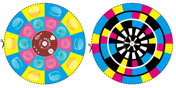 ・回転混色コマ(スイーツ編)はシアンと黄、シアンとピンクの回転混色盤。