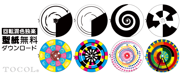 ・回転混色コマ(グレー編)は印刷インキで使用するCMY・CMYK・白黒の混色。回すとグレートーンが現れる。
