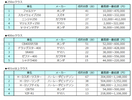 情報流通支援サービスの株式会社オークネット(本社:東京都港区/社長:藤崎清孝)は、 2014年12月度のオークネットバイクオークションにおける成約台数を集計し、排気量別ランキングベスト5をまとめました。