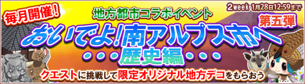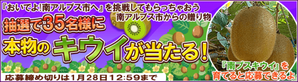 本イベントでは毎月ゲーム内でイベントを開催。同市にまつわるクエストのクリア報酬として円錐形土偶(国重要文化財)等同市オリジナルのデコレーションアイテムを配布いたします。また、ゲーム内で特定作物を育てると、抽選で同市特産フルーツ等を南アルプス市より毎月プレゼント。1月はキウイフルーツ(8~9玉)を抽選で35名様にお届けいたします。また、提携イベントは2015年2月まで毎月開催いたします。