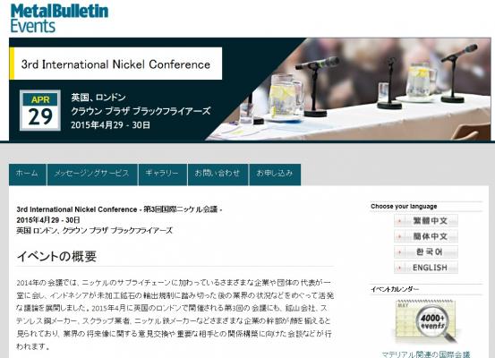 株式会社グローバル インフォメーションでは、皆様の利便性を図る為に、日本語、韓国語、中国語で「3rd International Nickel Conference - 第3回国際ニッケル会議」の情報を提供するとともに、会議の参加のお申し込みを承っております。