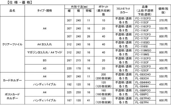 種類は、多用途に使えるスタンダードなA4サイズから、取扱い説明書などを保存しやすいA5サイズ、雑誌記事が保存できるマガジンサイズ、ハガキ・カードホルダーサイズまでの計9タイプ。フロントポケットのカラーは8色で、それぞれに不透明・透明の2タイプがあります。メーカー希望小売価格(税抜)は370~800円です。