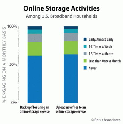 米国のブロードバンド世帯の62%はCarbonite、AcronisやBackblazenなどの企業がオプションサービスで提供しているにもかかわらず、データのバックアップにオンラインストレージサービスを利用していないことがパークスアソシエイツ社の新刊レポートで明らかになった。このことはデジタルコンテンツのユーザー利用が増加していることもあり、クラウドベースのストレージは2015年に大きな有望市場として見込まれることを示している。米国のブロードバンド世帯のスマートフォンユーザーはストリーミング音楽アプリを平均時間18分利用していて、この利用時間はゲーム、ソーシャルメディアやビデオアプリでの利用時間を超えている。