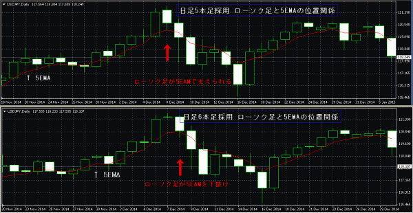 日足5本化により、移動平均線などのテクニカル指標の表示相違