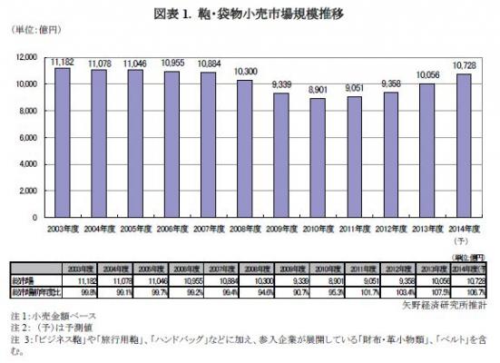 ◆ 2013年度の国内鞄・袋物市場規模は前年度比107.5%の1兆56億円、市場規模は1兆円台を回復