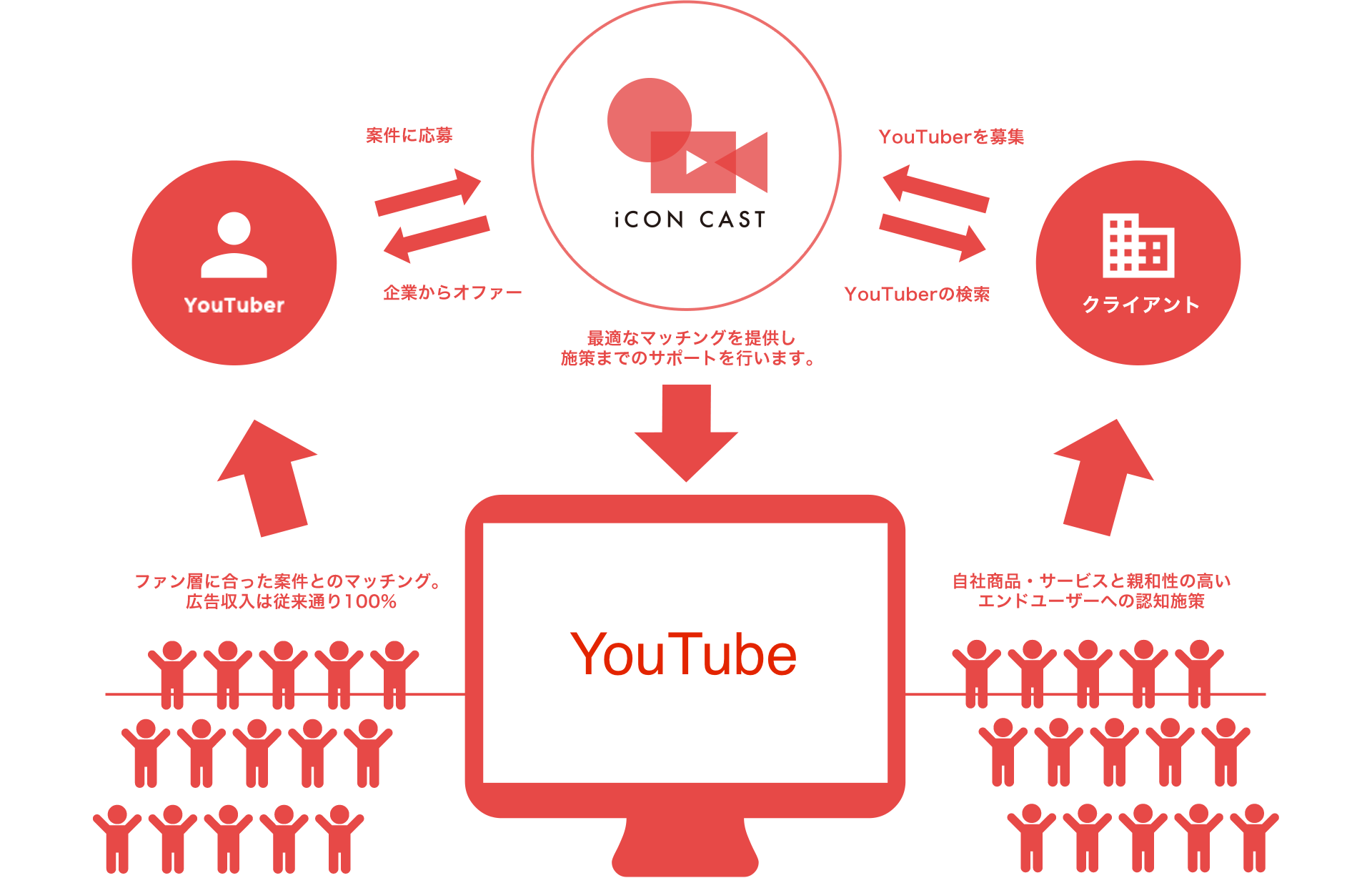 iCON CAST は、広い範囲のYouTuber を対象とし、スポンサーとなる企業の案件を探すことが出来るサービスです。従来スポンサー動画はスポンサーとなる企業側から訴求対象の商品・サービスと親和性の高いYouTuber に対してオファーを行うケースが大半でした。しかし、iCON CAST ではYouTuber 側から案件を選び応募出来る点が新しい価値を提供いたします。