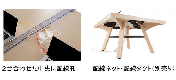 天板下には、ピンポン球をモチーフにした棚板を追加し、手荷物などの置き場所に。デスク2台を合わせた場合の中央部には、配線を取り出せる配線孔を設けました。別売りの配線ダクトや配線ネットも用途に応じてご活用ください。