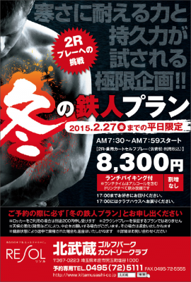 同様な極限企画は、真夏にも実施され好評を博しておりますが、昨年の「夏の鉄人(RESOL登録商標) 2.5Rへの挑戦」はGW~9月末までに1000名を超える来場をいただきました。ラウンド数への挑戦ということで夏の鉄人としてまいりましたが、冬季においてもご要望があり、今季における寒さとの闘いも鉄人としてふさわしいと考え、今回の企画に至ったものです。ラウンド数は2Rとなりますが、すでに予約も順調に入ってきており、人気商品としての気配を感じております。