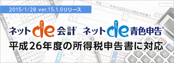 株式会社パイプドビッツ(本社 東京都港区、代表取締役社長 CEO 佐谷宣昭、証券コード3831、以下「パイプドビッツ」)は、2015年1月28日に、中小規模事業者や個人事業主向けのクラウド型会計ソフト「ネットde会計(R)」「ネットde青色申告(R)」をバージョンアップし、平成26年分所得税確定申告書式に対応した新バージョン15.1.0を提供開始しましたので、お知らせいたします。