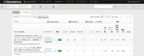 Ginzamarkets株式会社株式会社(本社:カリフォルニア州サンフランシスコ/東京都港区、代表取締役社長:レイ・グリセルフーバー)は2015年1月に、コンテンツマーケティング&SEO管理プラットフォームである『Ginzametrics』のソーシャル評価機能のバージョンアップを行いました。