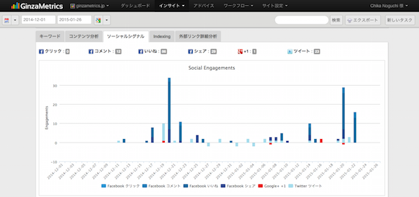 以前のソーシャル評価機能においては、指定日におけるソーシャルシグナル累積数値を表示していましたが、ソーシャル評価指標のデータを日次保有することにより、ソーシャルシグナルの推移を把握できるようになりました。モニタリングするソーシャルメディアはFacebook、Twitter、Google+が対象となります。