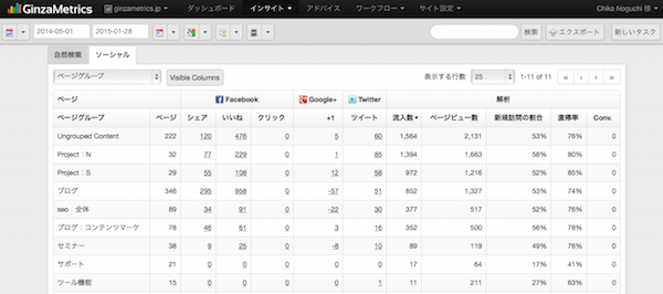 <グループ単位でのソーシャルシグナルの広がり、流入数、ページビュー等を表示>