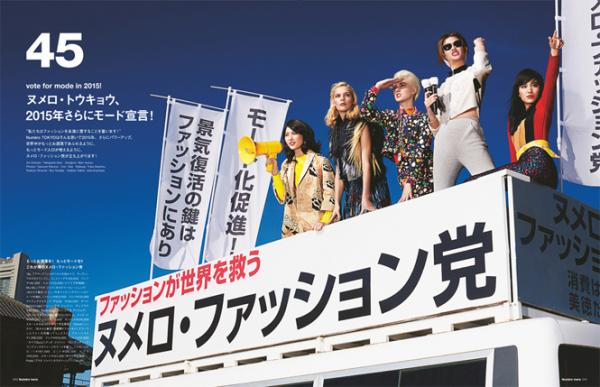 「私たちはファッションを永遠に愛することを誓います」。ヌメロ・トウキョウはそんな思いで2015年、さらにパワーアップ。その第一弾として、1月28日発売の2015年3月号では、ファッション党による選挙活動を実施!? 選挙カーでの街頭演説、政見放送… 独自のスローガンを掲げたファッションストーリーを皮切りに、世界中がもっとお洒落であふれるように、もっとモード人口が増えるように、ヌメロ・ファッション党が立ち上がります!