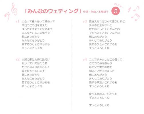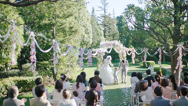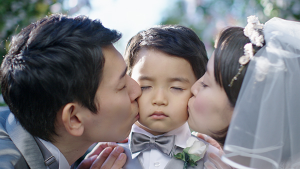 「誓いのキス編」は子供と一緒に挙げる結婚式、ファミリーウェディングをテーマとし、数々の受賞歴を有するCMプランナーの本間絹子氏(株式会社電通)が手掛けました。CM中に流れるテーマ曲「みんなのウェディング」の作詞作曲も本間氏によるものです。