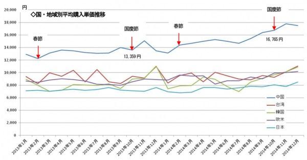 中国の平均購入単価は、2013年1月から2014年12月までの2年間で約4,600円増加しています。また、国・地域別で中国に次いで平均購入単価が高い台湾と比べると、2013年は約4,000円あった差が、2014年では約6,000円と更に拡大しています。