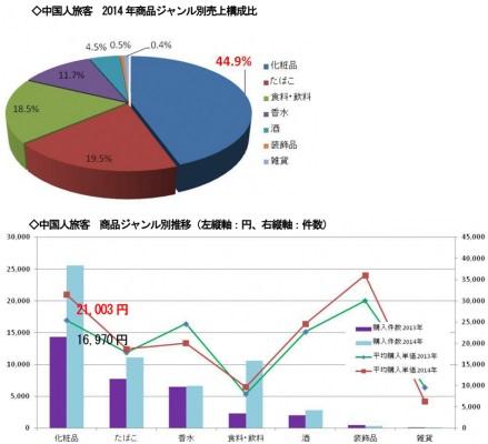 免税店の利用客が増加する中、2014年の主な国・地域別に見た売上構成比は日本が52.3%、中国が36.6%、韓国が2.2%、台湾が1.3%となりました。この中で、中国の購入件数は前年比171.3%、金額では198.4%と増加。その結果、2013年には66.2%あった日本の割合が約5割に減少し、中国は12.2pt.伸ばし全体の4割近くを占める結果となりました。