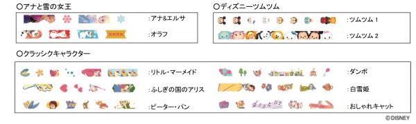 デザインは全部で10種類。現在幅広い年齢層に大ヒット中の「アナと雪の女王」からは、「アナ&エルサ」と「オラフ」の2柄。ぬいぐるみとスマートフォン向けアプリケーションゲームが大人気の「ディズニーツムツム」からは、縦使いの「ツムツム1」と横ライン使いの「ツムツム2」の2柄。そして、ディズニークラシックキャラクターからはレトロな雰囲気のタッチで、「リトル・マーメイド」「ふしぎの国のアリス」「ピーター・パン」「ダンボ」「白雪姫」「おしゃれキャット」の6柄。どれもオトナ可愛く、ディズニー好きの心くすぐるデザインです。