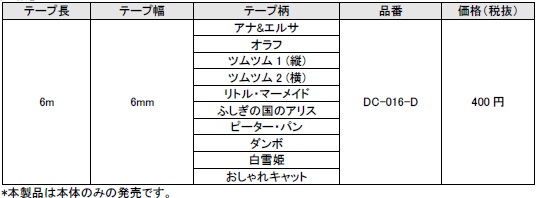 テープを引くだけでポップなデザイン柄が転写される「デコラッシュ」。小中学生を中心に大人の女性まで幅広い世代から支持されています。今回は待望の「ディズニーコレクション」が登場。昨年話題を呼んだ映画「アナと雪の女王」2柄、スマートフォン向けアプリケーションゲームが大人気の「ディズニーツムツム」2柄、そしてどこか懐かしくて上品な、オトナ可愛いデザインのディズニークラシックキャラクター6柄の数量限定アイテムです。カードや手紙、スケジュール帳を、楽しくデコレーション♪ メーカー希望小売価格(税抜)は400円です。