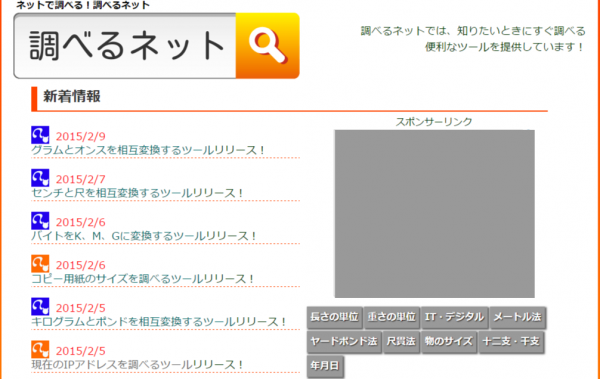 『調べるネット』は、「知りたいときにすぐ調べる」をコンセプトに、曜日、干支、IPアドレス、テレビのサイズ、封筒の大きさ、等、様々な事柄を簡単に調べられる機能を有し、さらに長さや重さなどの様々な単位を変換するツールも備えたウェブサイトです。