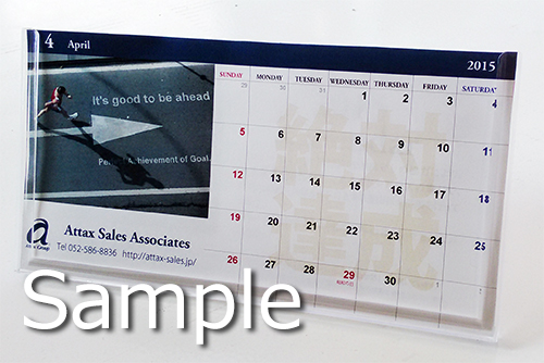 今回は、セミナー受講者全員にアタックス・セールス・アソシエイツの「絶対達成カレンダー」(2015/04~2016/03)を進呈いたします。 右の日付欄には大きく「絶対達成」という文字が、左の写真には「絶対達成」を意味する「Perfect Achievement of Goal」というフレーズがすべての月に印字されています。