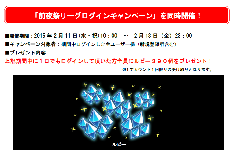 上記期間中に1 日でもログインして頂いた方全員にルビー390個をプレゼント!