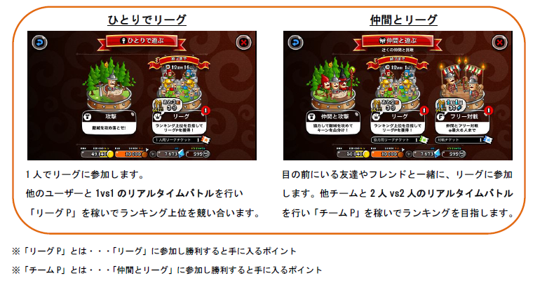 他のユーザーと1vs1 のリアルタイムバトルを行い「リーグP」を稼いでランキング上位を競い合います。